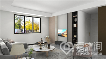 客厅色调采用了大面积白色,给人一种清新的感觉,灰色布艺沙发和几何地毯提升了室内的现代格调。