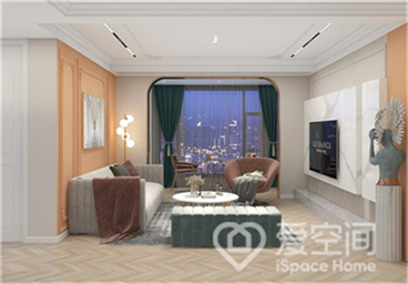 客厅与餐厅一体化设计,室内家具简单而实用,精致的软装展示出优雅和耐用性,增强了空间的实用氛围。