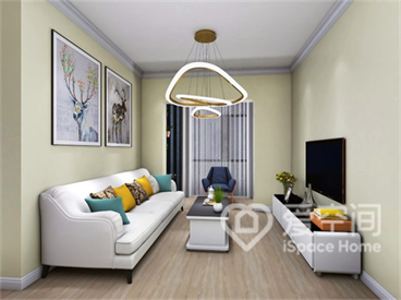 因为是轻日式风格,客厅处选用低位沙发,搭配拥有编织感的灯罩和挂件、木色的柜子和奶茶色的小驴摆件,整体营造一种舒适自然的氛围。